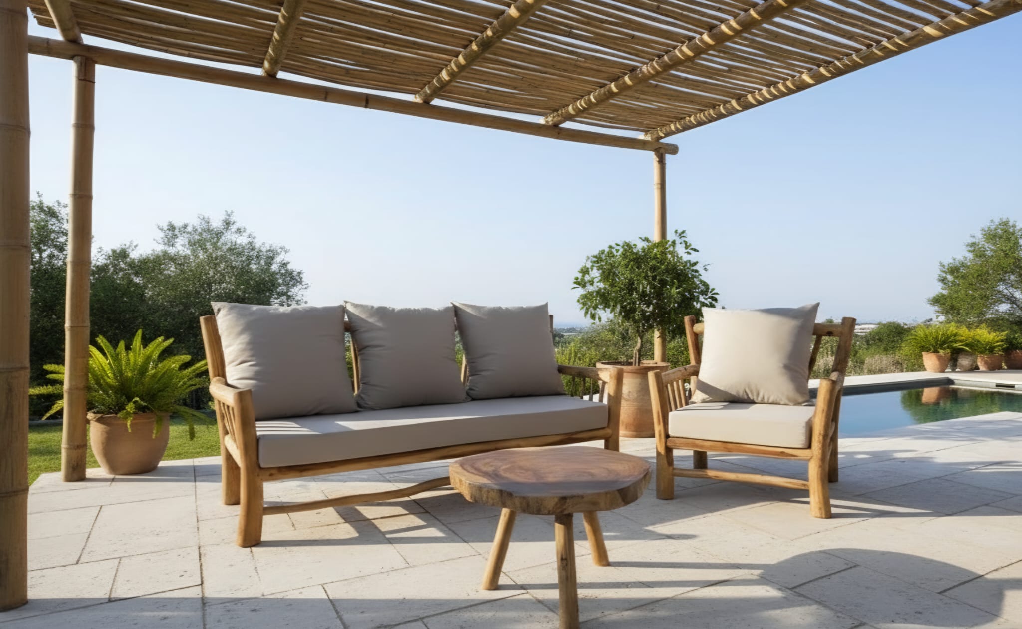סלון חוץ מפנק דגם בננה גימור עץ מולבן סט ריפוד איכותי אקרוסל ארוטקס הסט כולל 2 ספות תלת במידה 80*210 + 2 כורסאות יחיד מפנקות 80*80 ושולחן סט 60*120 מחיר מבצע: 10,800 ש"ח