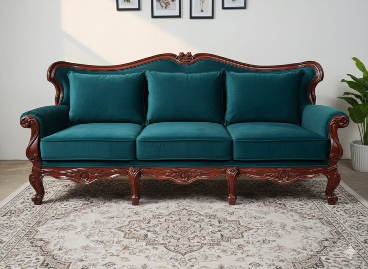 סט פינת ישיבה עץ טיק דגם בננה ספה זוגית במידה 80*150 + 2 כורסאות יחיד 80*80 ושולחן 60*120 כולל ריפוד בד אקריסול מחיר מבצע: 5,900 ש"ח