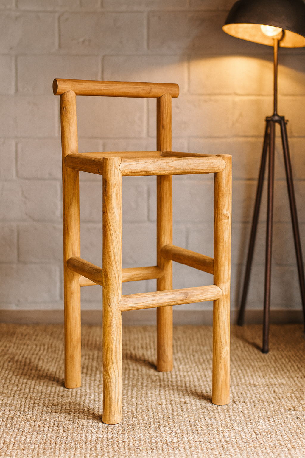 כיסא בר עץ מלא משטח עליון גזע רגל מעץ טיק במחיר מבצע: 590 ש"ח
