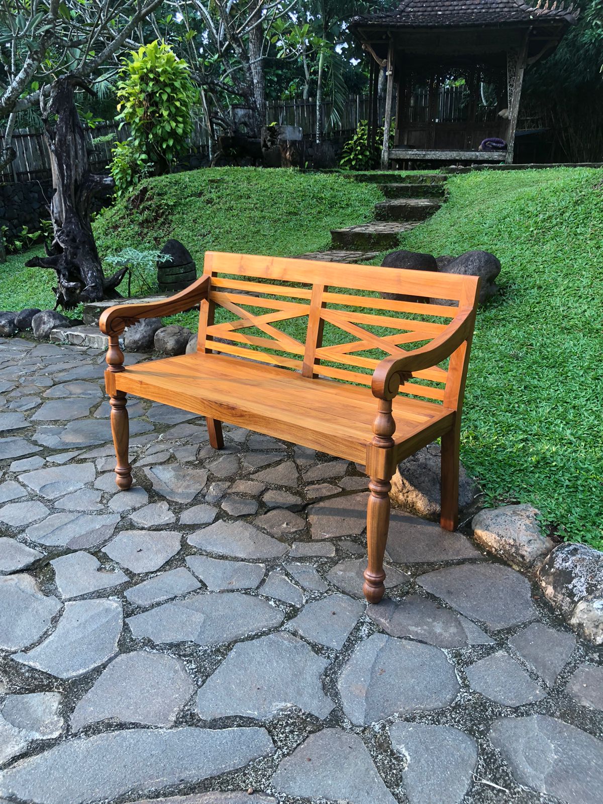 ספסלים עם משענת בצורת גלגל עם חישורים אלכסוניים היוצאים ממרכזו. ניתן לשלב ספסל זה בכל גינה בה נדרש עיצוב אותנטי. בעבר היו מתכננים גם את שערי הבתים הפרטיים בצורה של גלגל מחושר אם אתם גרים בבית שהחצר נמצאת מול שער שכזה, עיצובו על גבי הספסל עשוי מאד להתאים.